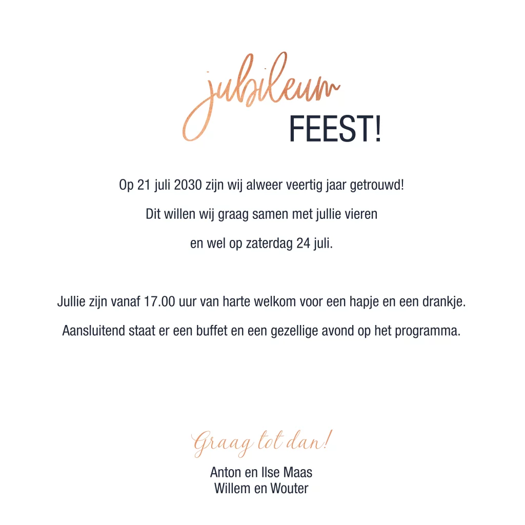 Chique jubileumkaart met het getal veertig als middelpunt van de kaart. Op de binnenzijde is er ruimte voor de trouwfoto. Een mooie persoonlijke jubileum uitnodiging.