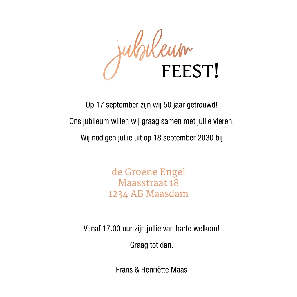 Jubileumkaart voor een 50 jarig huwelijk met de tekst vijftig in brons look. Maak de uitnodiging persoonlijk door foto's op de binnenzijde toe te voegen.