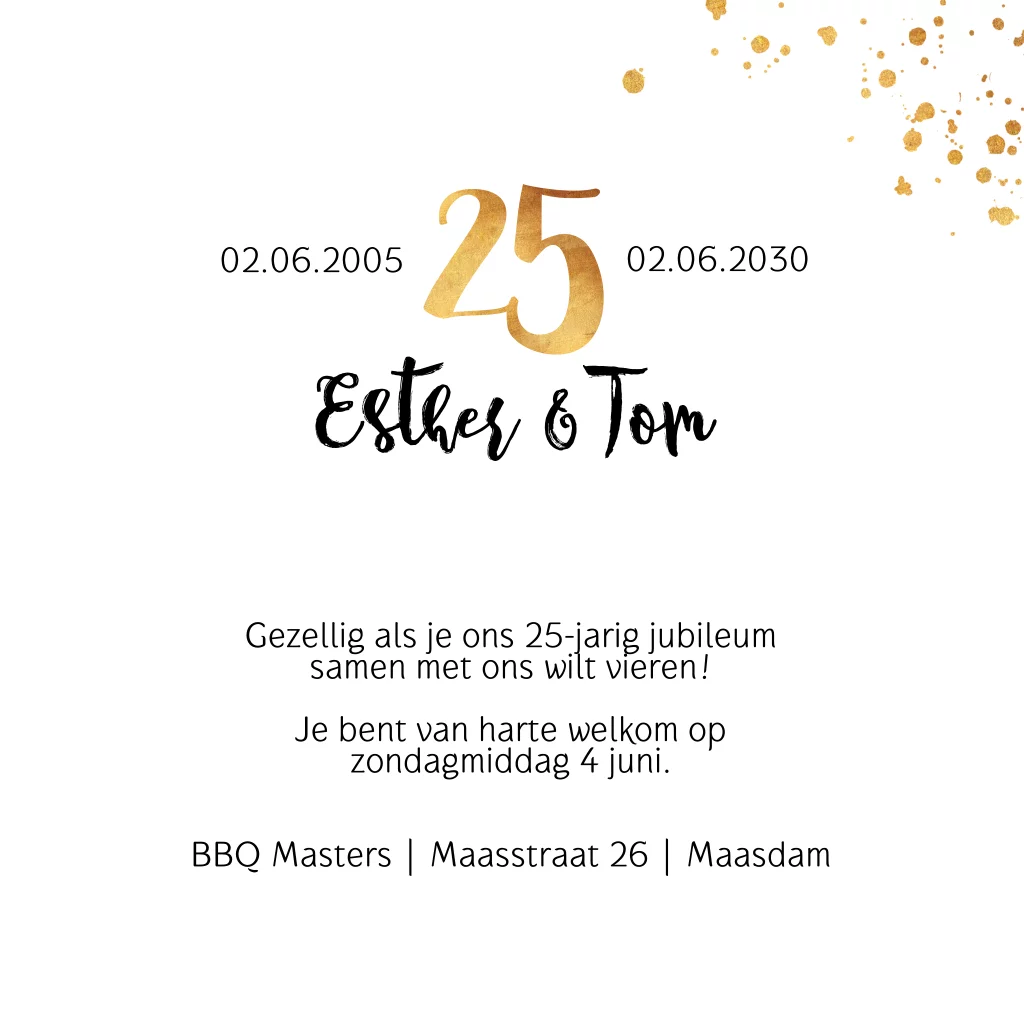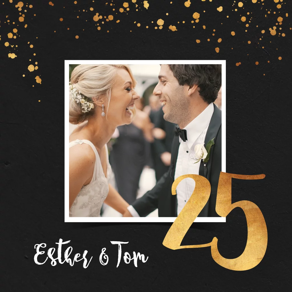 Feestelijke jubileumkaart in zwart met spetters en het cijfer 25 in goud look. Met een mooie trouwfoto op de voorzijde maak je eenvoudig je persoonlijke uitnodiging.