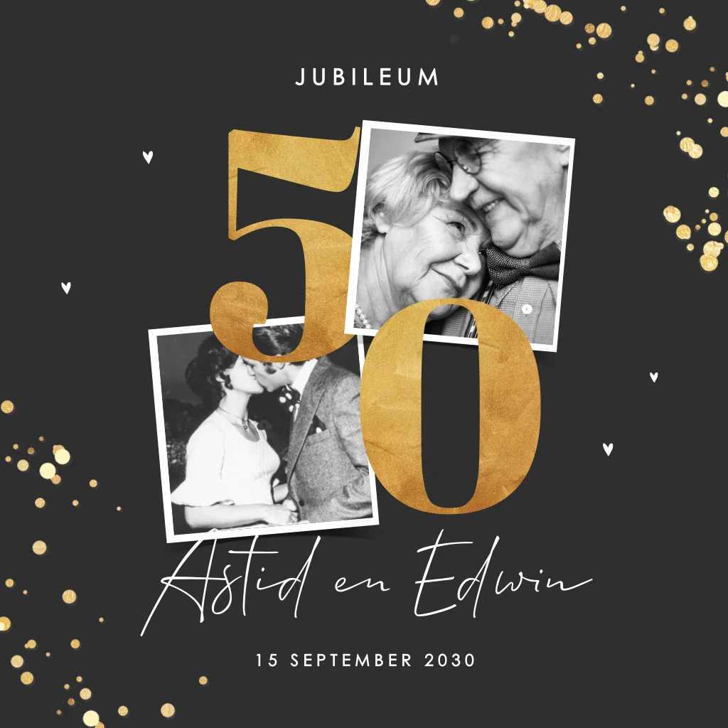 Jubileumkaart 50 jaar getrouwd in zwart en goud met foto's