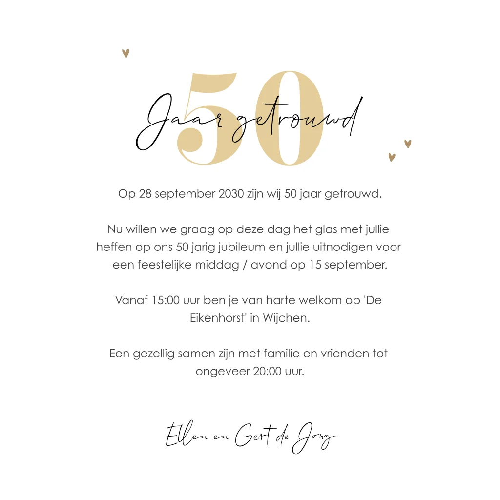 Stijlvolle uitnodiging voor een gouden bruiloft, mooie combinatie van zwart en goud met eigen foto's.