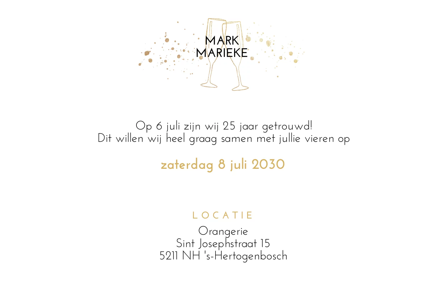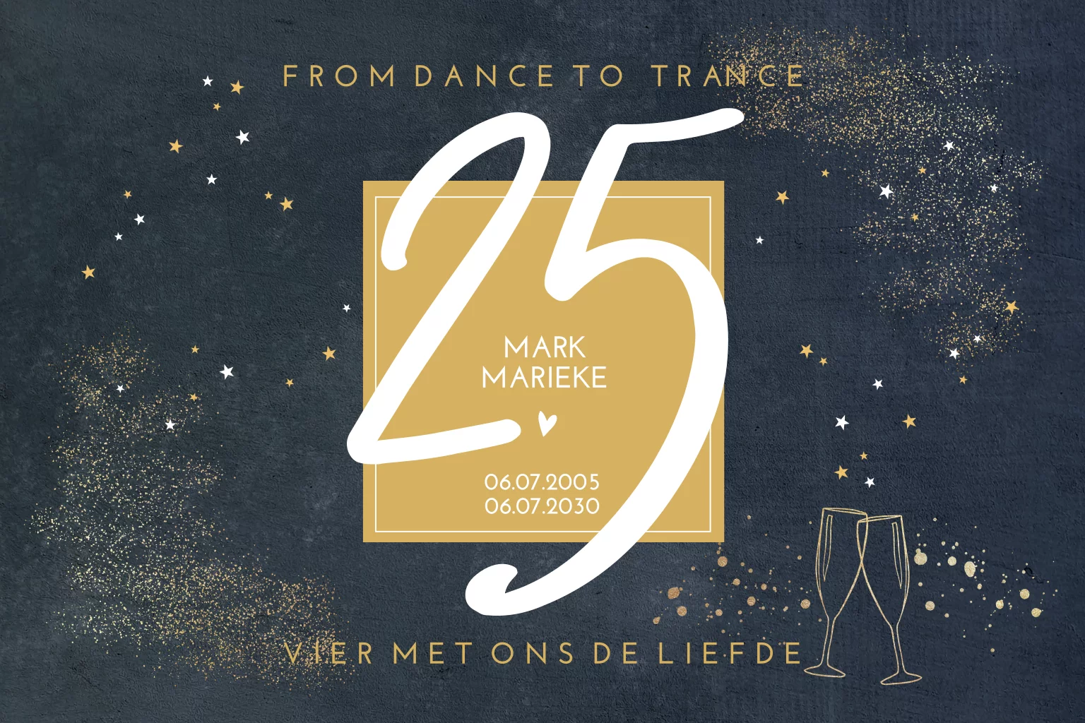 Een uitnodiging 25 jaar getrouwd goud met donkerblauw. De spetters en sterren geven de kaart een extra feestelijke uitstraling. Het jubileumjaar staat centraal en springt er mooi uit.