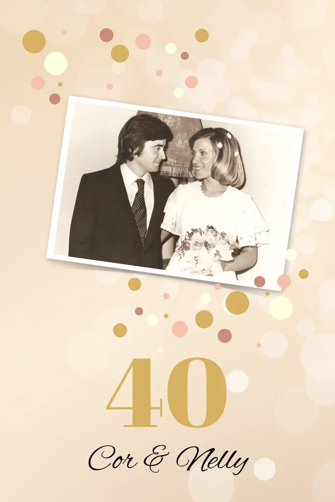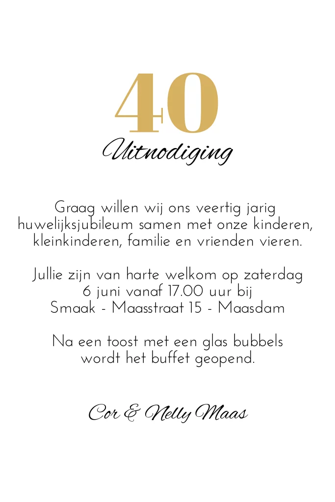 Originele uitnodiging voor een 40-jarig huwelijksjubileum. Persoonlijk met trouwfoto op de voorzijde van de jubileumkaart.