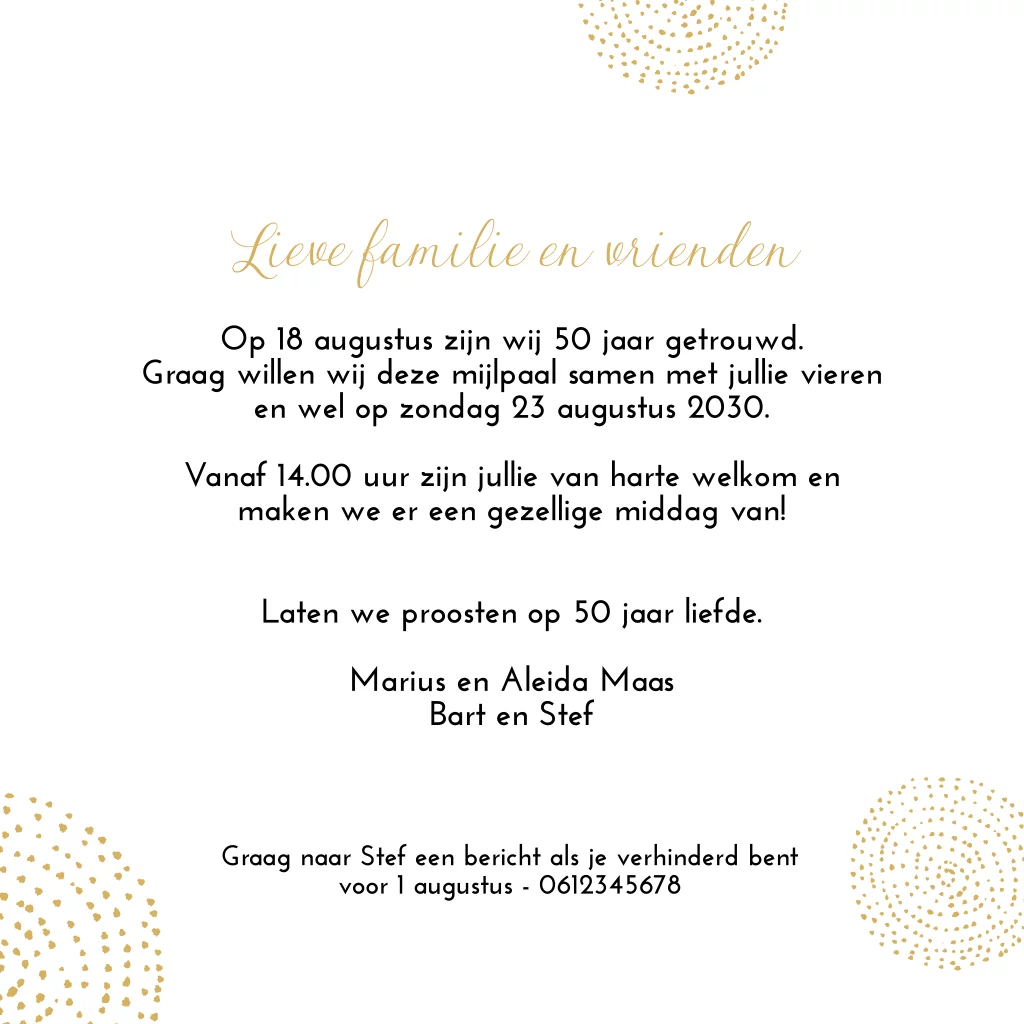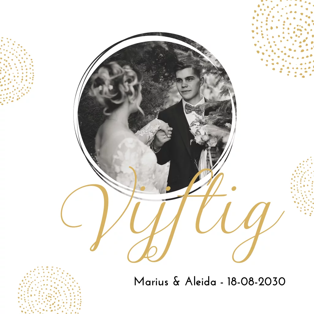 Jubileum uitnodiging voor een 50-jarig huwelijk met trouwfoto in zwart wit en met gouden details. Maak de uitnodigingskaart compleet met gouden envelop.