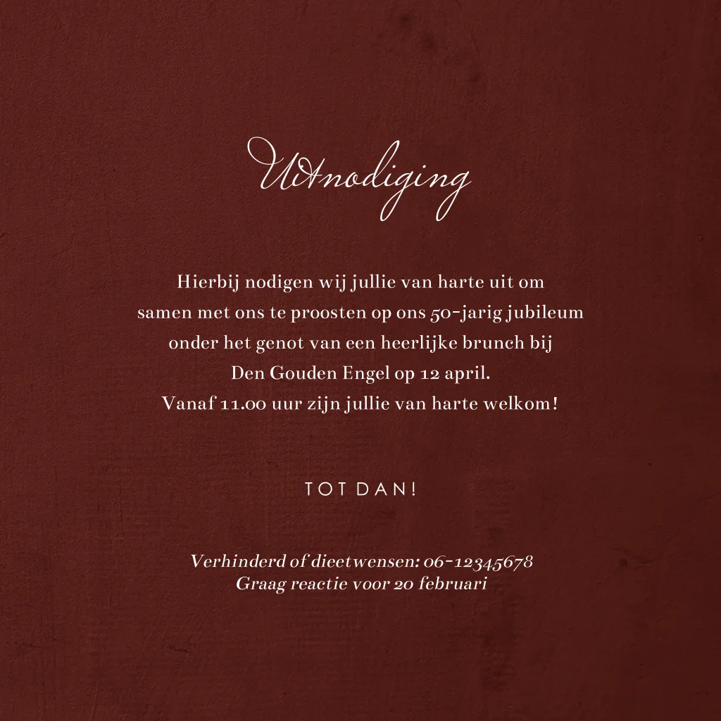 Klassieke uitnodiging 50 jaar getrouwd in rood met foto's en mat goudfolie