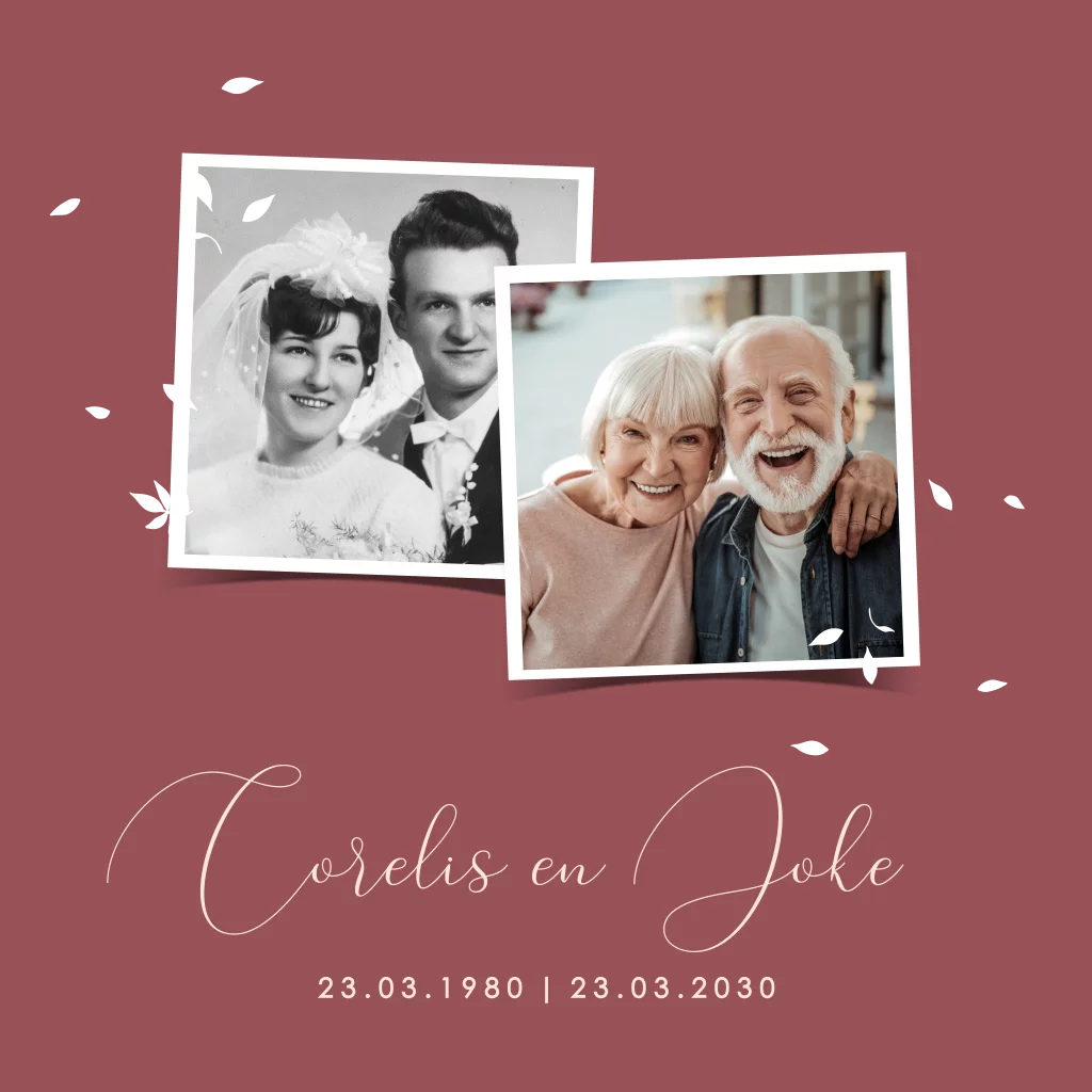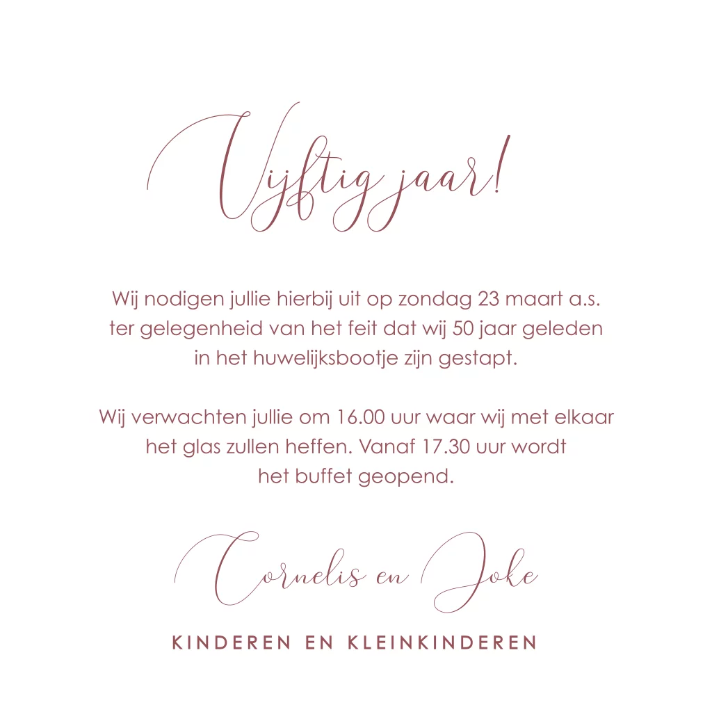 Een ontzettend persoonlijke kaart om vrienden en familie uit te nodigen voor jullie 50 jarige jubileum. Voeg gemakkelijk twee foto's toe via de editor en zorg voor een unieke uitnodiging.