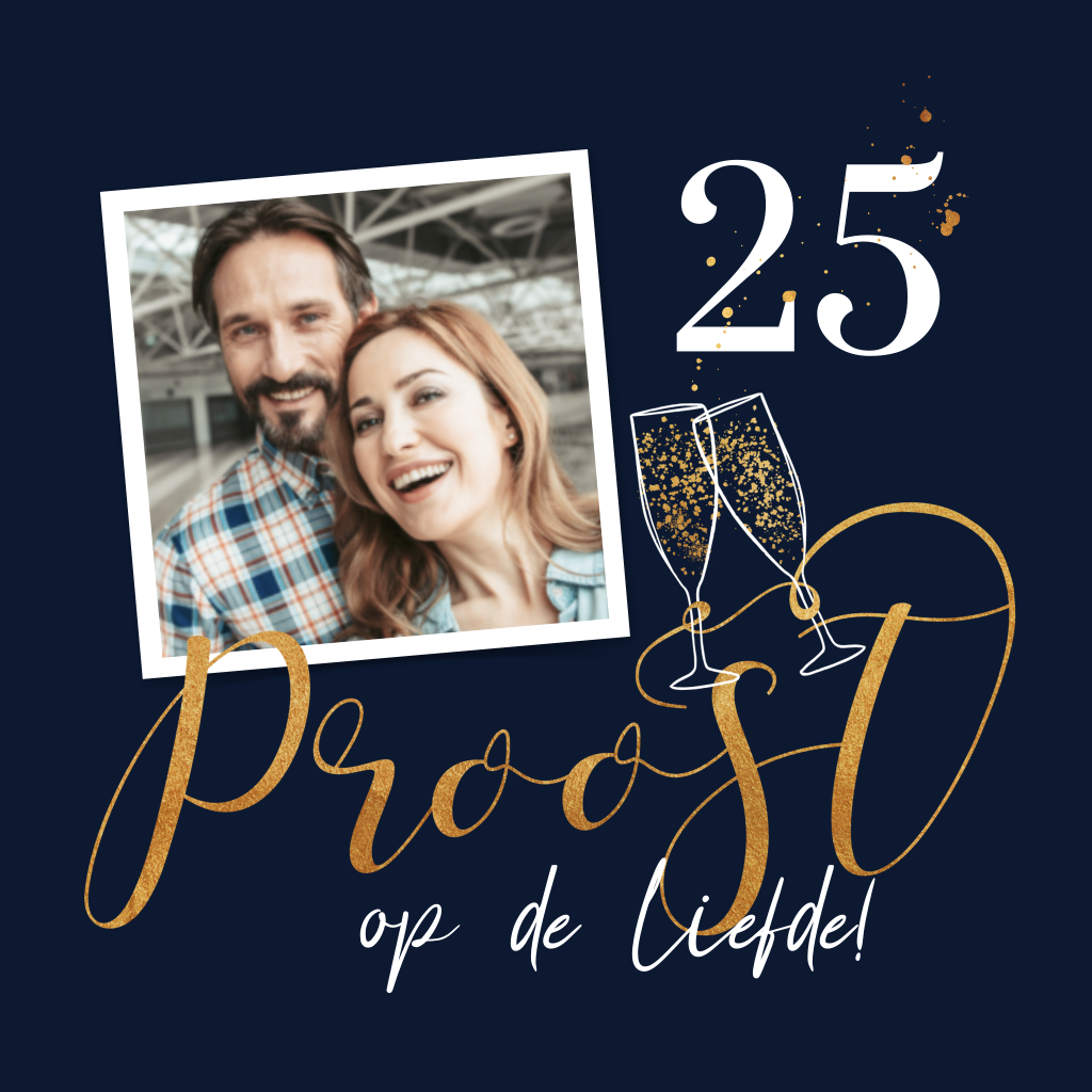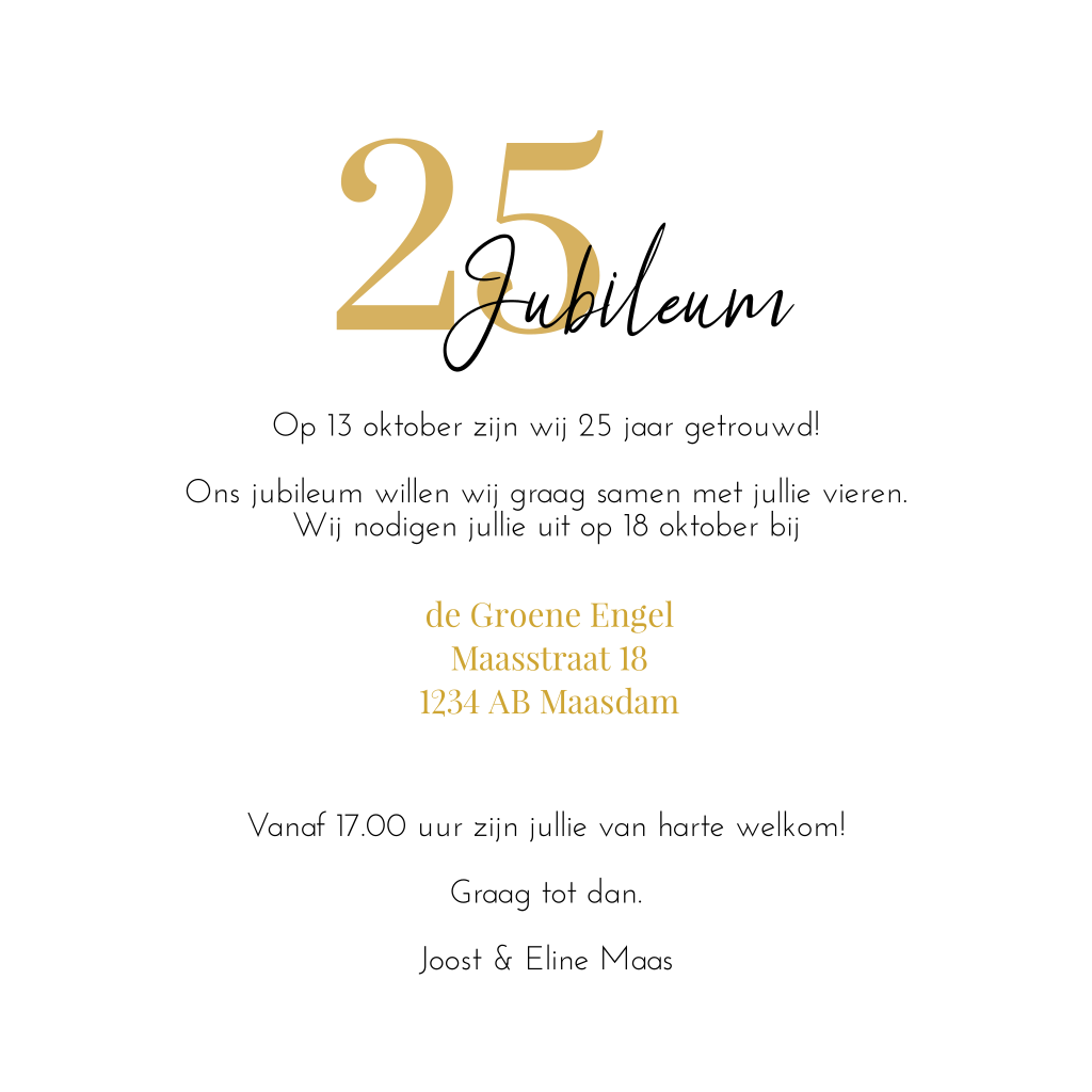 Een stijlvolle uitnodiging voor een 25-jarig huwelijksjubileum. Maak eenvoudig je persoonlijke uitnodiging door de foto op de voorzijde te vervangen, bijvoorbeeld voor jullie trouwfoto.