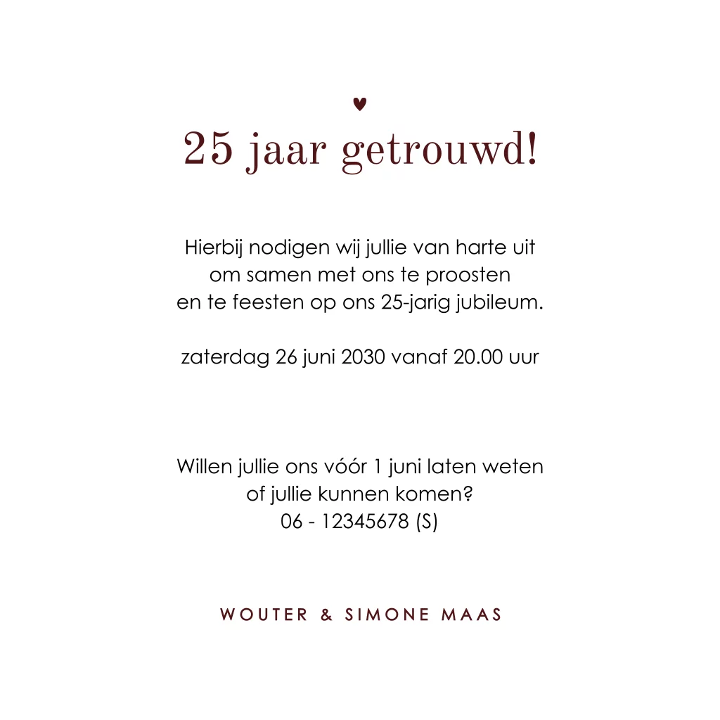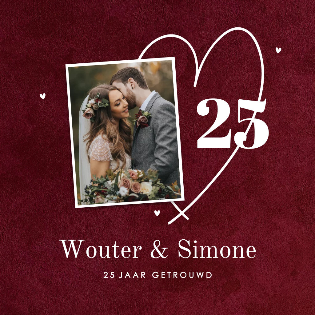 Originele uitnodiging 25 jaar getrouwd met velvet look achtergrond en trouwfoto. Een mooie persoonlijke uitnodiging voor jullie huwelijksjubileum.