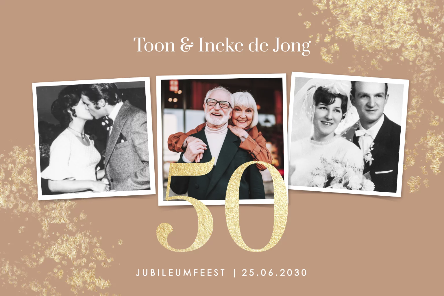 Originele jubileum uitnodiging gouden bruiloft met foto's van vroeger en nu. De goud look spetters en het cijfer 50 geven de jubileumkaart een extra feestelijke uitstraling.