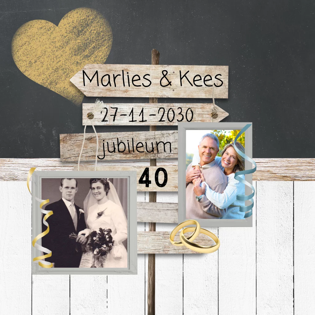 Met deze originele uitnodiging met stoer hout en foto's nodig je familie en vrienden uit voor jullie veertigjarig huwelijksjubileum.