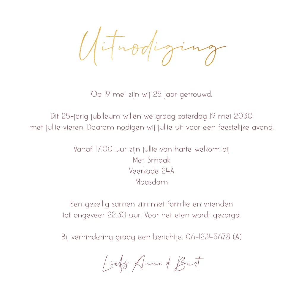 Persoonlijke uitnodiging 25 jarig huwelijksjubileum met trouwfoto op de voorzijde.