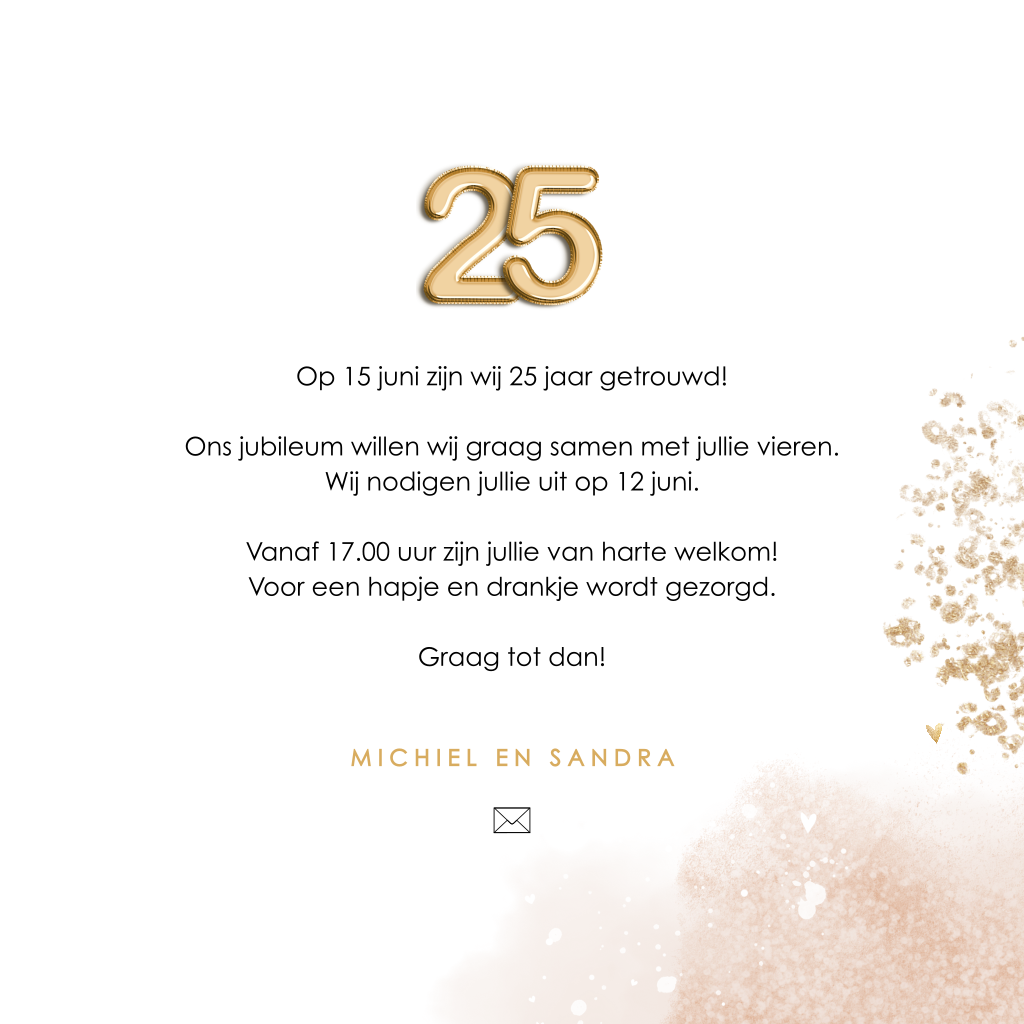 Chique uitnodiging 25 jaar met watercolour en goudconfetti