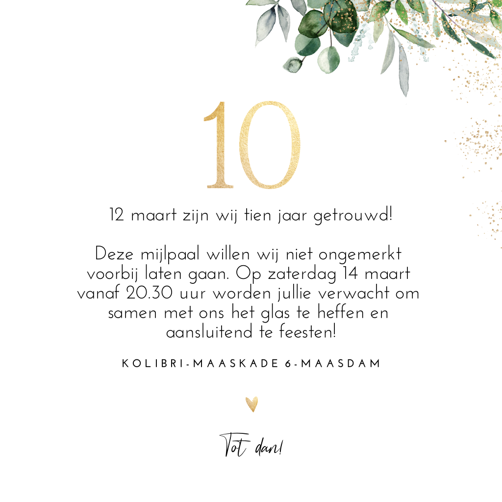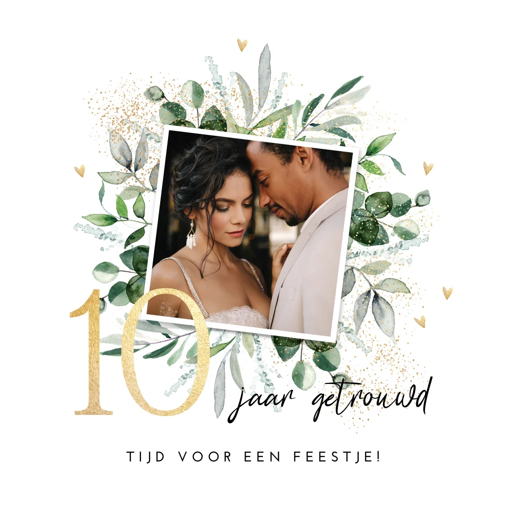 Sierlijke uitnodiging voor een 10 jarig huwelijksjubileum. Met een stijlvol goudkleurige tien en mooi versierd met geïllustreerde eucalyptus en takjes. Op de voorkant is ruimte voor een persoonlijke foto.