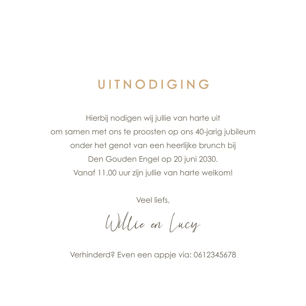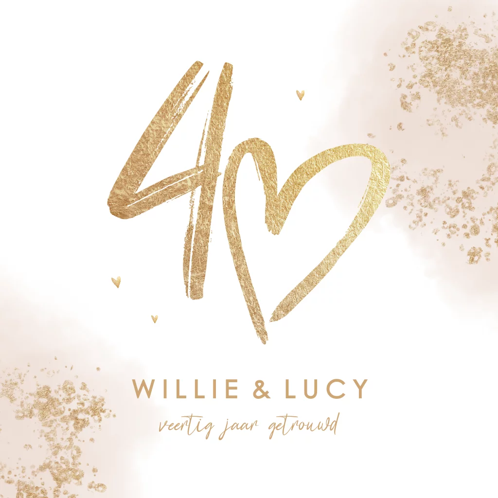 Een mooie jubileum uitnodiging voor jullie 40-jarig huwelijk. Het hartje en de goudlook spetters geven deze jubileumkaart een extra feestelijke uitstraling.
