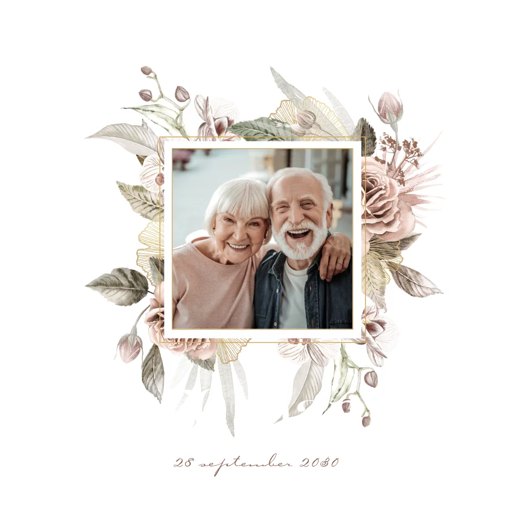 Jubileumkaart 50 jaar getrouwd met bloemendesign en foto