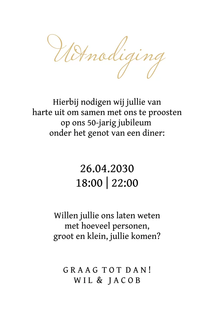Wil je eenvoudig een kaart maken voor jullie vijftigjarig huwelijksjubileum? Kies dan voor dit ontwerp, voeg jullie eigen teksten toe en de kaart is klaar om te versturen. Een stijlvolle uitnodiging!