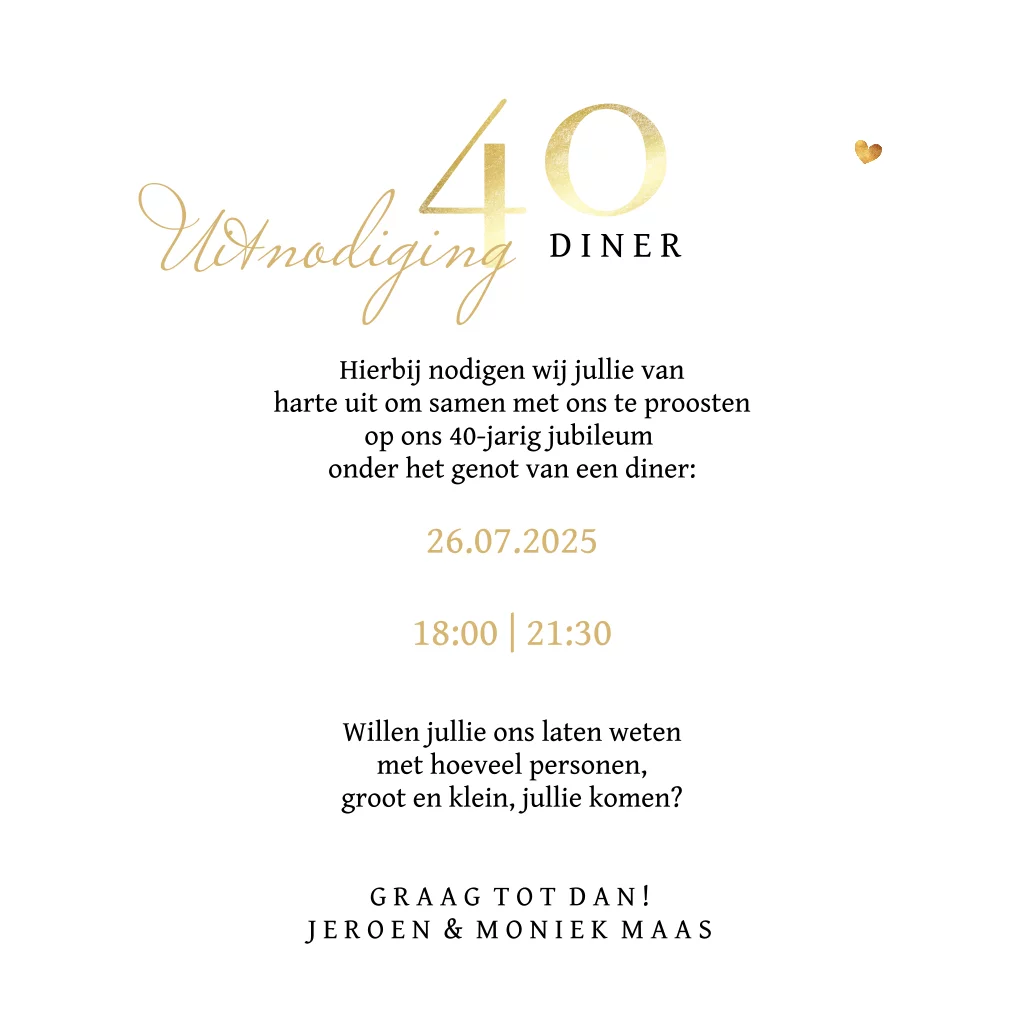 Nodig jullie dierbaren uit met deze stijlvolle jubileumuitnodiging voor jullie veertigjarige bruiloft.