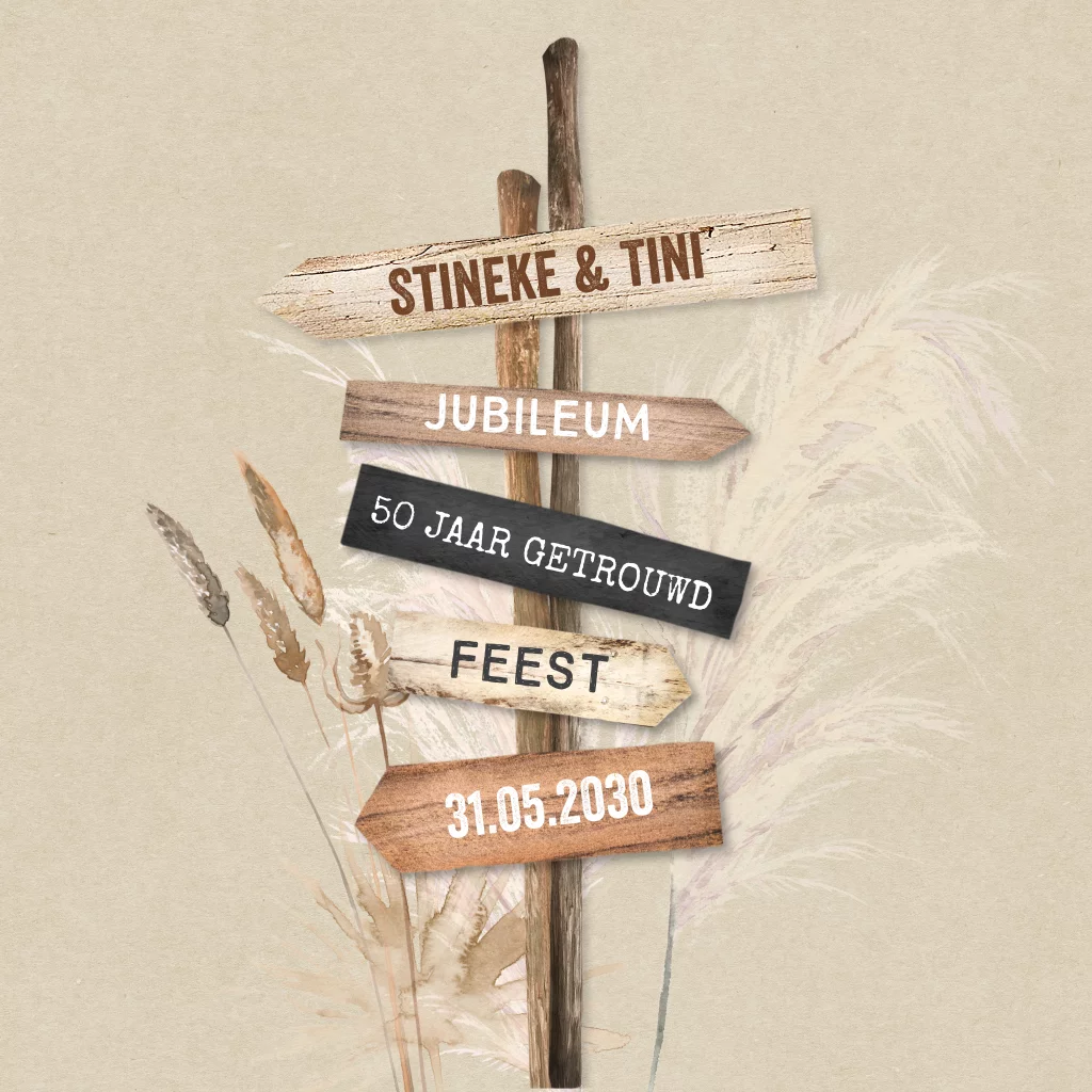 Originele jubileumkaart gouden bruiloft met kraft achtergrond, droogbloemen en een mooie bijpassende wegwijzer. Origineel en stijlvol!