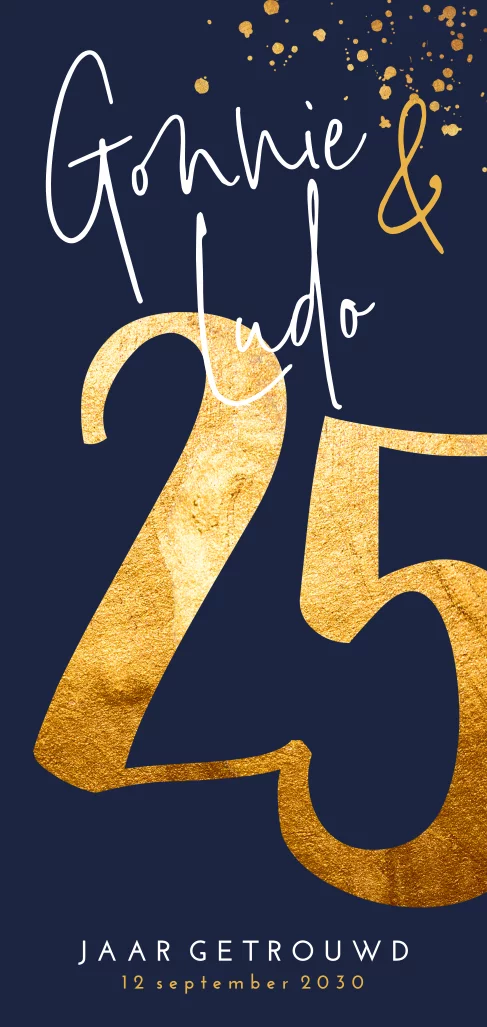 Stijlvolle uitnodiging in donkerblauw met het jubileumjaar in goud look zodat deze er mooi uitspringt. Gouden spetters geven de kaart een extra feestelijke uitstraling.