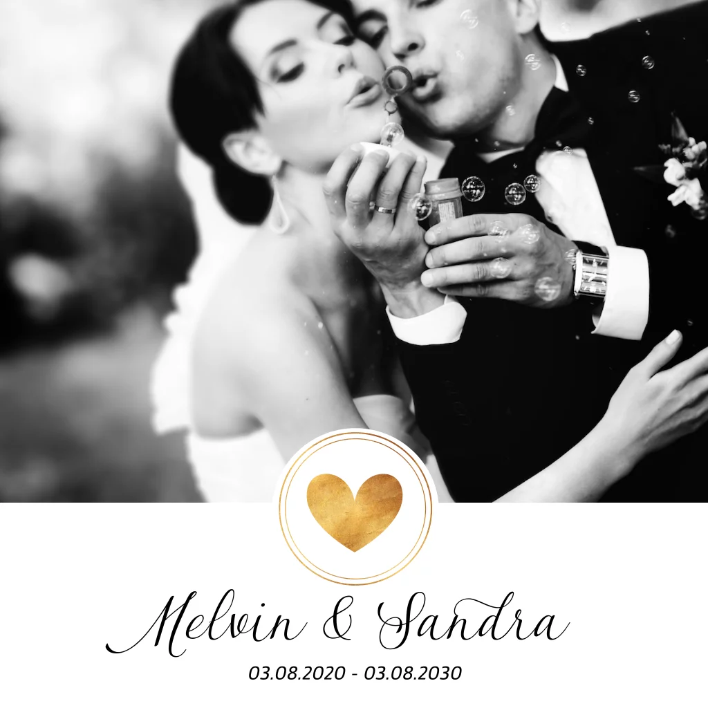 Fotokaart jubileum 10 jaar getrouwd met gouden hartje