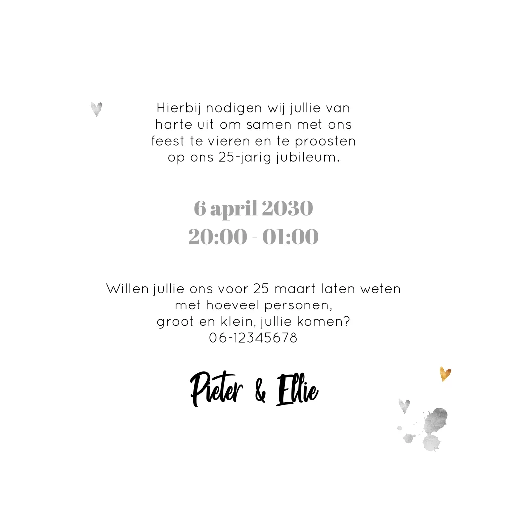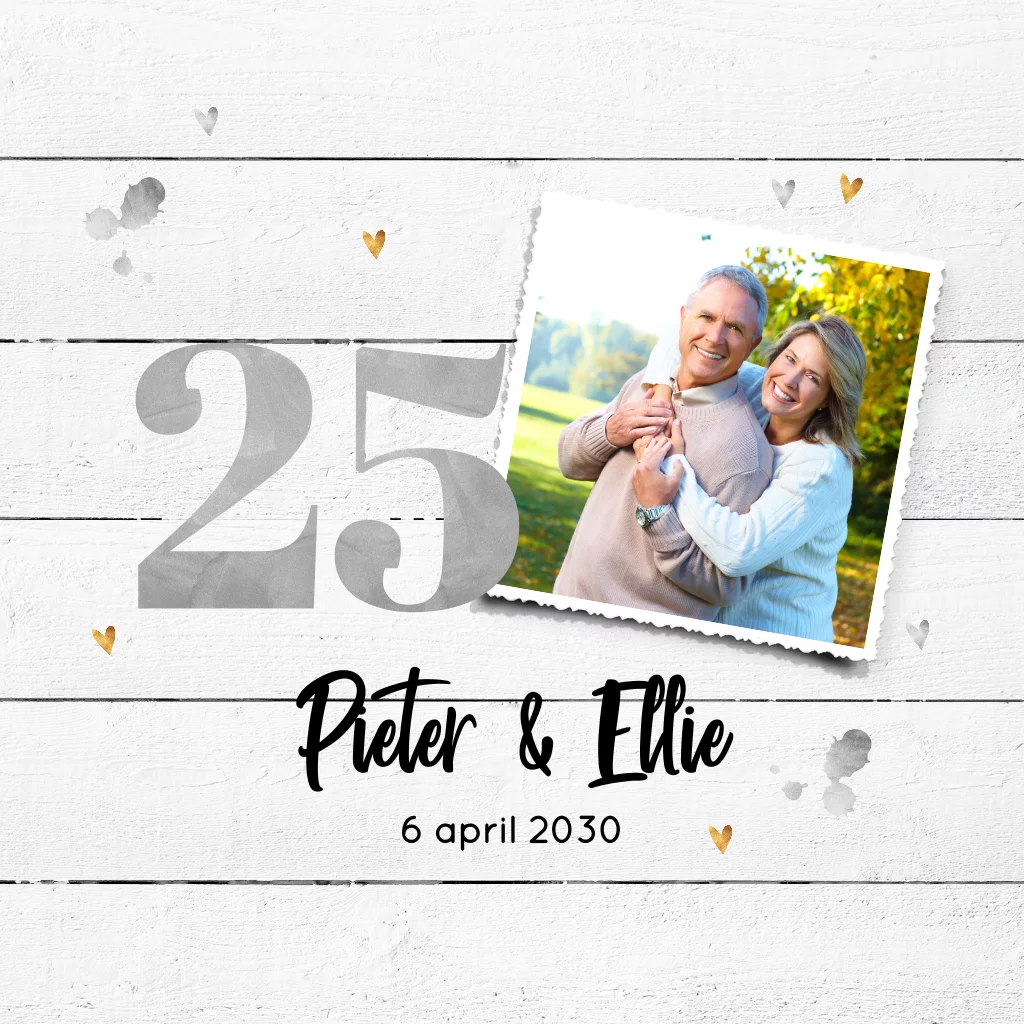 Jubileum uitnodiging met steigerhout en het cijfer 25 in zilver look. Liever geen foto op de kaart? Verwijder deze dan eenvoudig en maak zo je persoonlijke jubileumkaart.