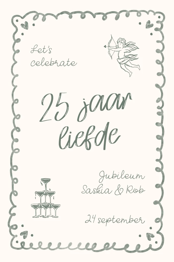 Vrolijke jubileumkaart 25 jaar getrouwd met groene illustraties en speels kader. Pas datum, locatie en jullie namen aan en maak zo eenvoudig je persoonlijke uitnodiging.