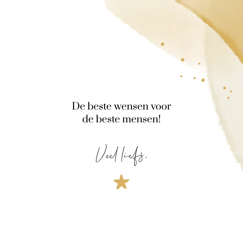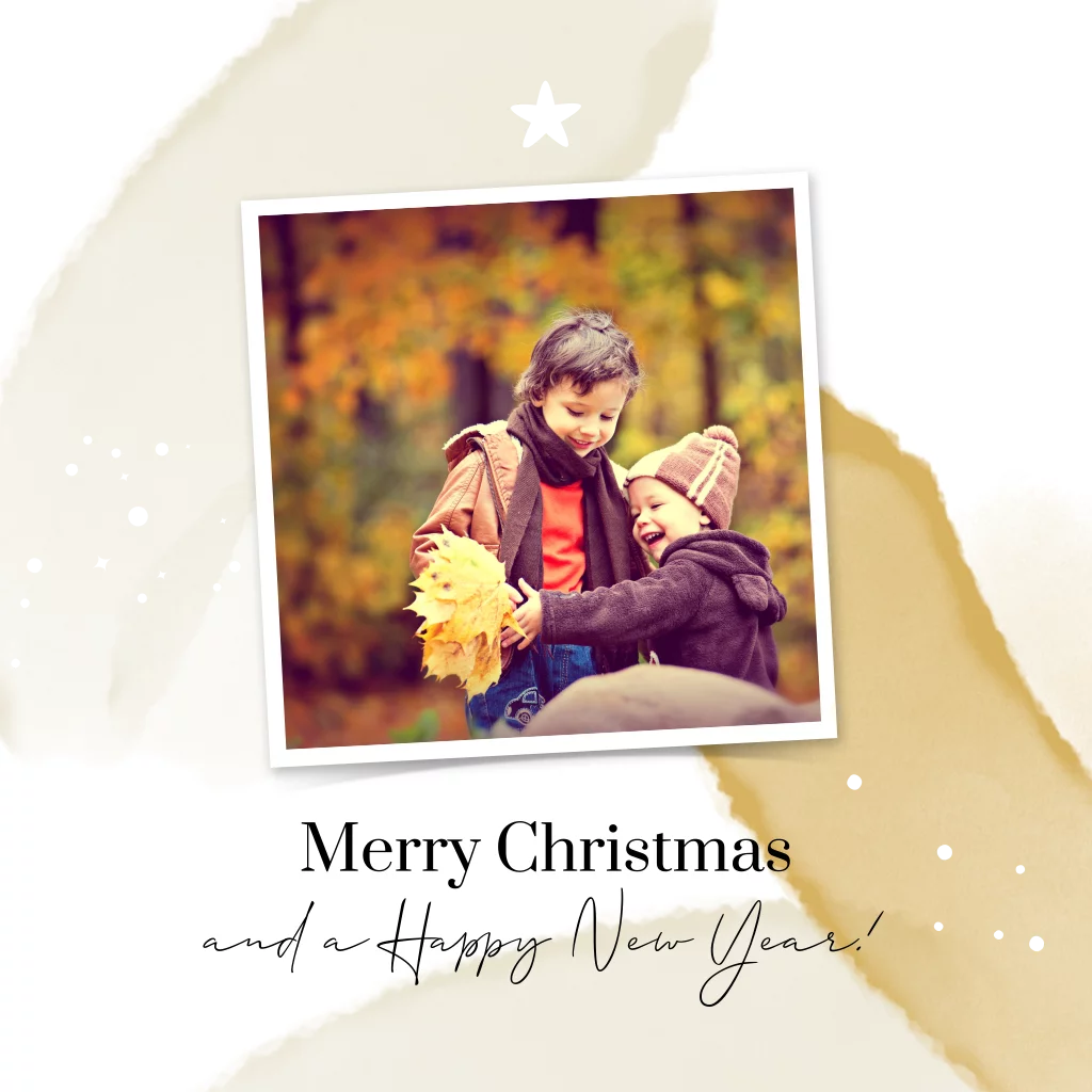 Vrolijk kerstkaartje met ruimte voor een eigen foto op de voorzijde. De goudfolie spetters om de foto geven de kaart een extra feestelijke uitstraling.