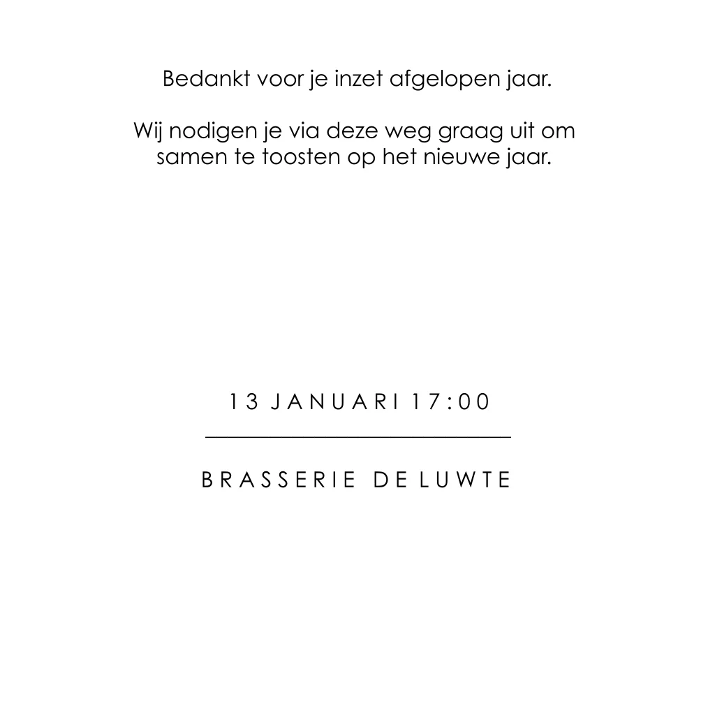 Voeg het logo van jullie organisatie en een eigen tekst toe en maak zo eenvoudig je persoonlijke uitnodiging nieuwjaarsborrel.