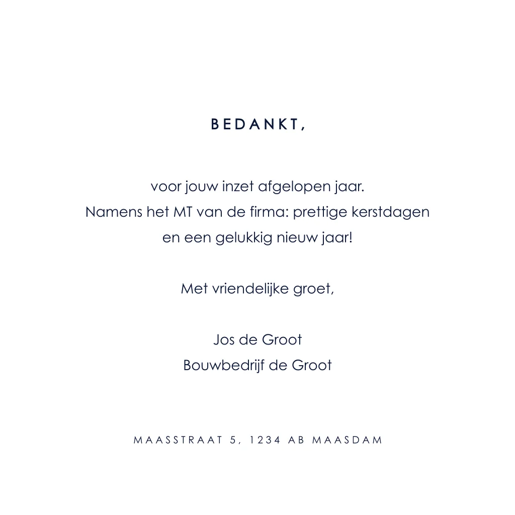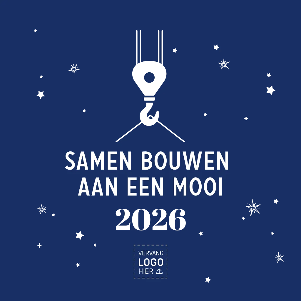 Een zakelijke kerstkaart speciaal voor de bouw. Dit kaartje heeft een donkerblauwe achtergrond en details in goudfolie. Voeg gemakkelijk zelf het logo en een foto van jullie organisatie toe en maak de kaart persoonlijk met een eigen tekst.