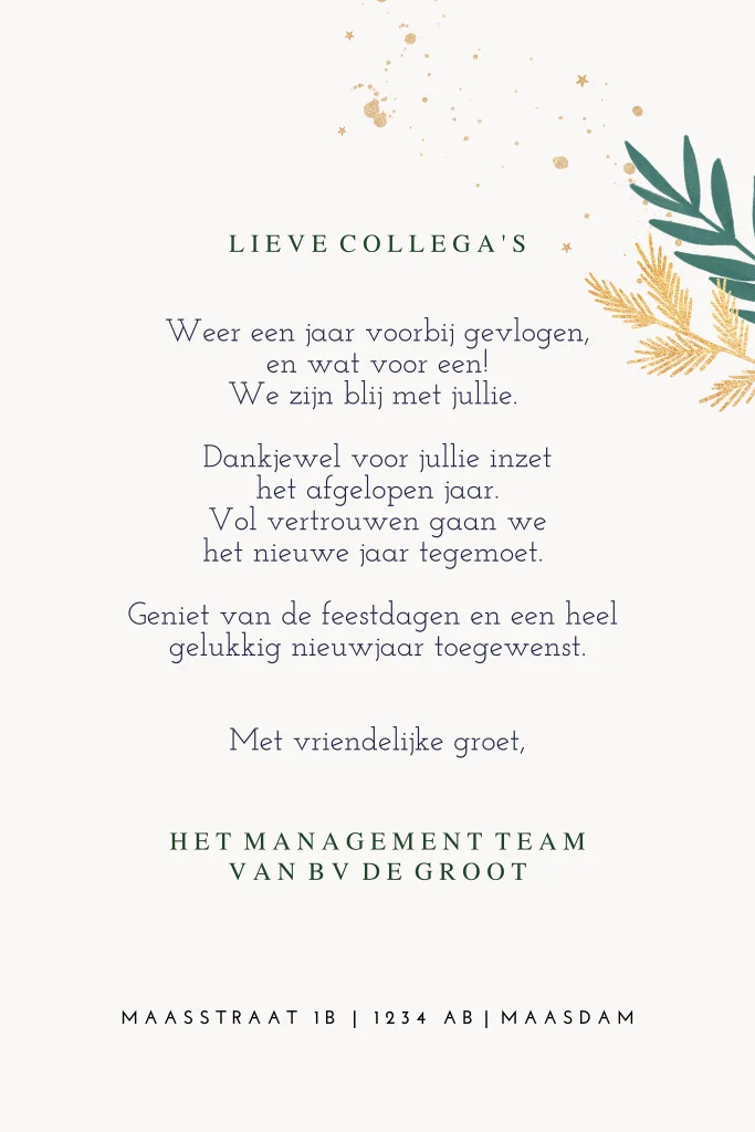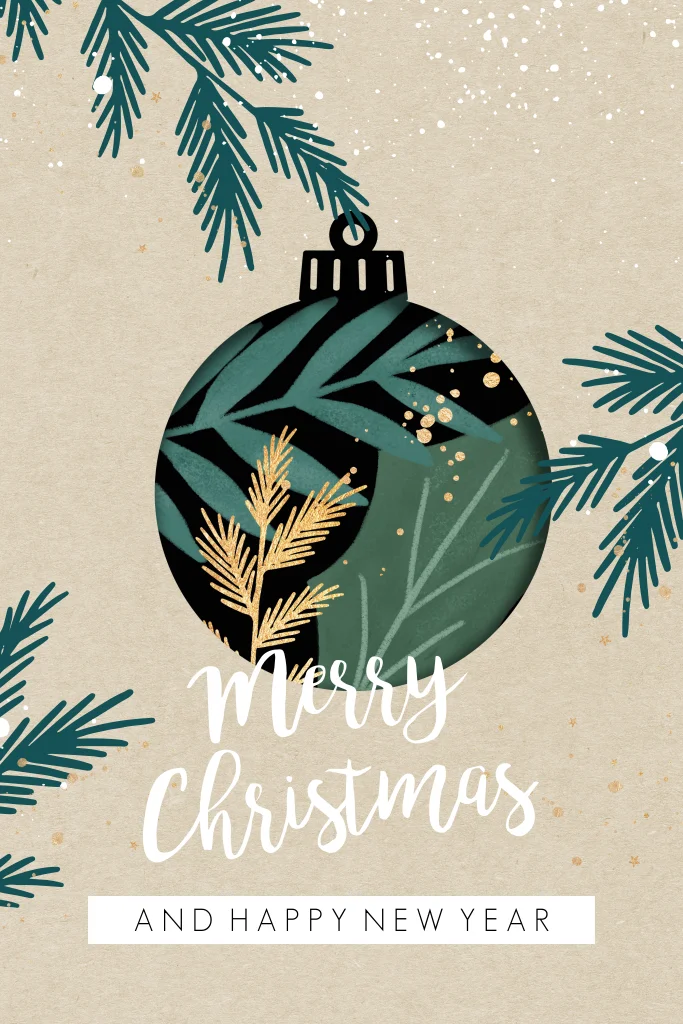 Een zakelijke kerstkaart met dennentakken en een mooie kerstbal. Stuur dit stijlvolle ontwerp naar je werknemers en maak écht indruk! Voeg gemakkelijk zelf het logo en een foto van jullie organisatie toe en maak de kaart persoonlijk met een eigen tekst.