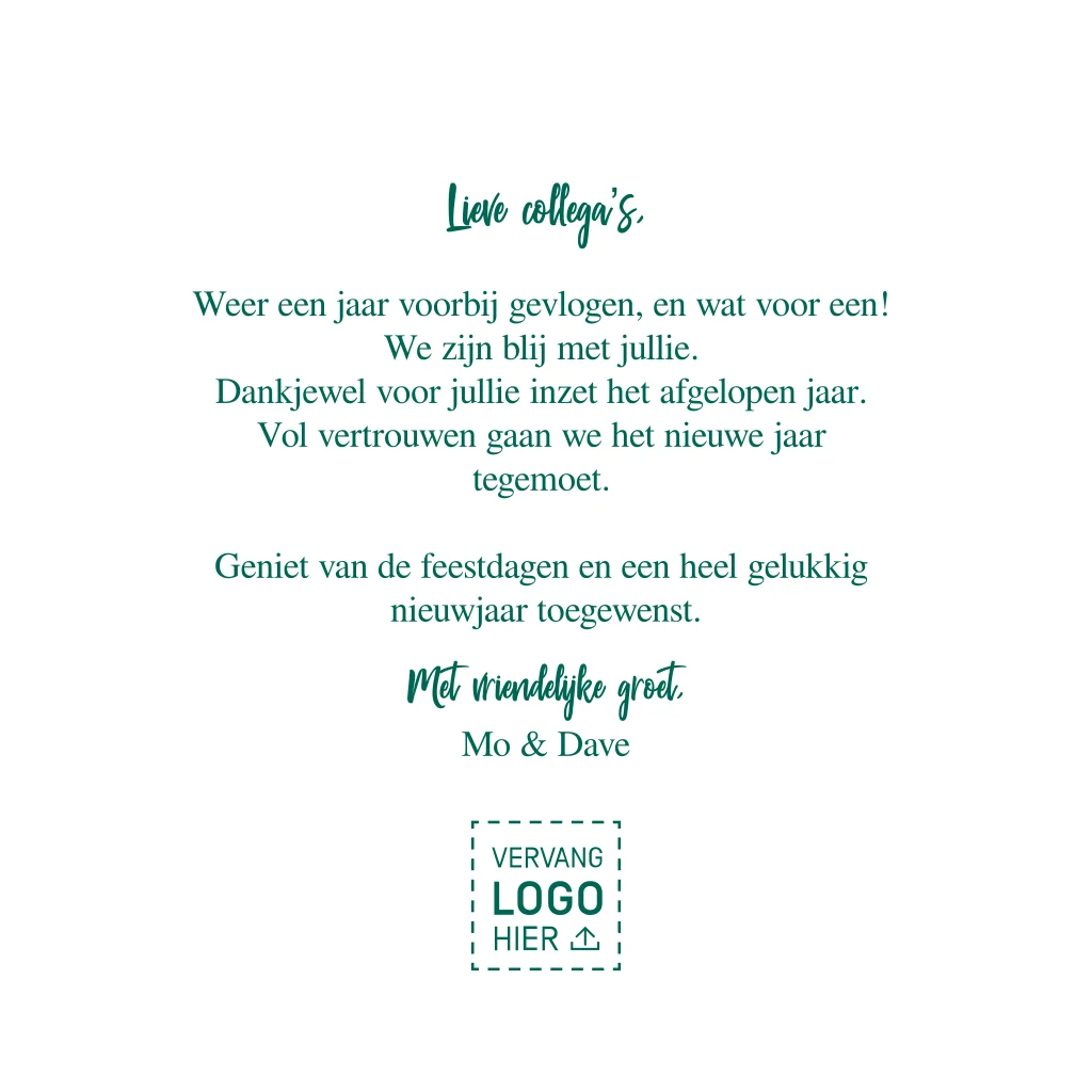 Deze kerstkaart is perfect om naar je medewerkers te versturen. De kerstkrans, de vrolijke tekst en het goudfolie maken samen een uniek en feestelijk ontwerp! Voeg gemakkelijk zelf het logo en een foto van jullie organisatie toe en maak de kaart persoonlijk met een eigen tekst.