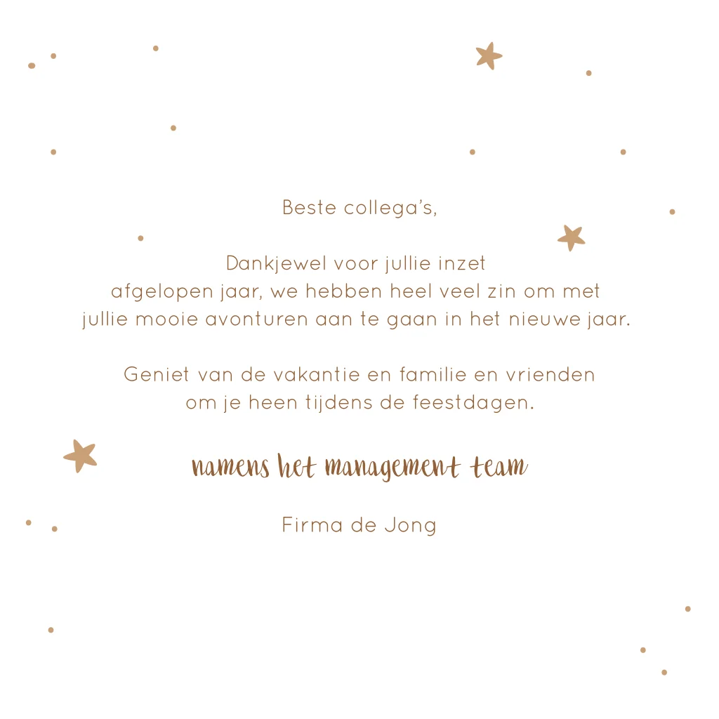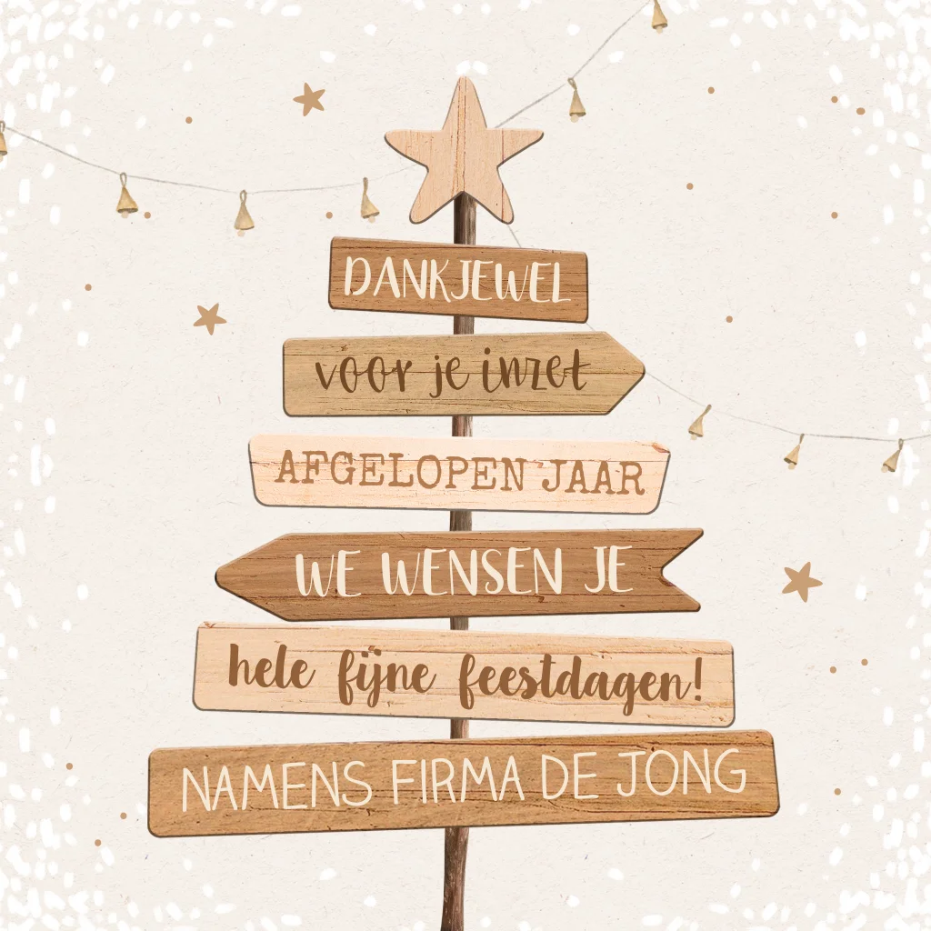 Deze kerstkaart heeft een klassiek ontwerp; er is een houten wegwijzer in de vorm van een kerstboom te zien. Perfect om te sturen naar de medewerkers van jouw bedrijf. Voeg gemakkelijk zelf het logo en een foto van jullie organisatie toe en maak de kaart persoonlijk met een eigen tekst.