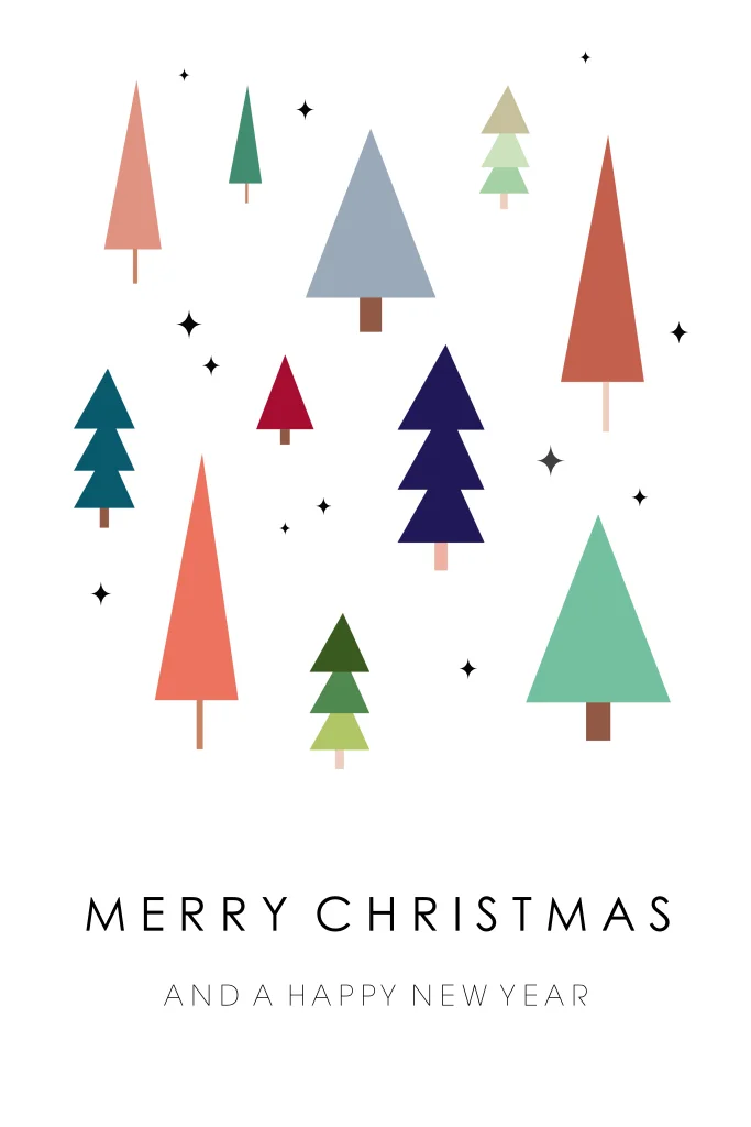 Vrolijke kerstkaart met gekleurde kerstbomen