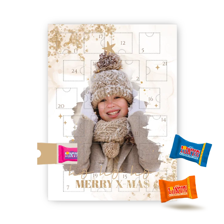 Tel de decembermaand af tot kerst met een persoonlijke adventskalender met Tiny Tony’s. Kies voor dit stijlvolle beige design met eigen foto in kerstboomvorm en gouden spetters. Ga helemaal los met jouw favoriete foto’s en teksten en geef een adventskalender cadeau of bestel er lekker een voor jezelf!