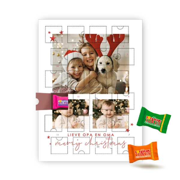 Tel de decembermaand af tot kerst met een persoonlijke adventskalender met Tiny Tony’s. Dit feestelijke design met eigen foto's en kerst versieringen geeft je dat heerlijke wintergevoel! Ga helemaal los met jouw favoriete foto’s en teksten en geef een adventskalender cadeau of bestel er lekker een voor jezelf!