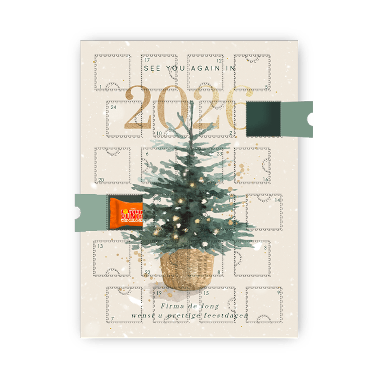 Chocolade adventskalender zakelijk met kerstboom en gouden details