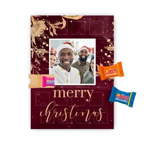 Zakelijke adventskalender chocolade in rood en goud met eigen polaroid foto