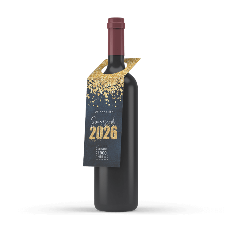Wat een uniek relatiegeschenk voor de feestdagen is deze wijnhanger met gouden glitters! Je hangt de hanger gemakkelijk aan de hals van een fles.