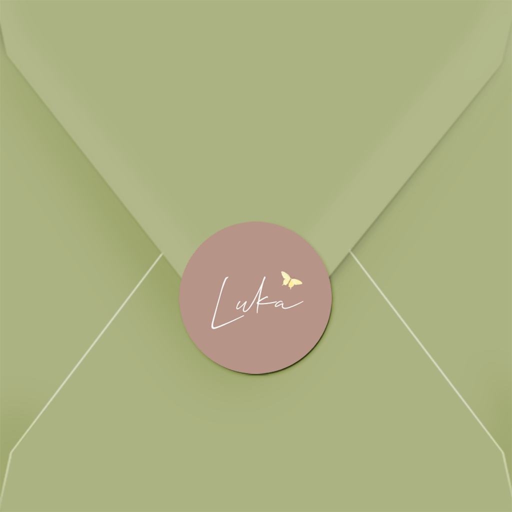 Naamsticker met vlinder in voorjaarsthema. Je kunt de sticker zelf bewerken in onze editor.