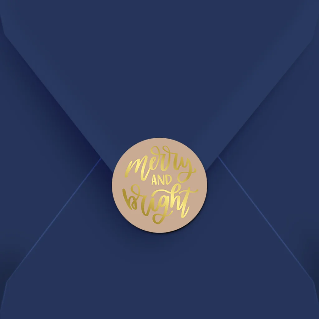 Maak van de kerstkaart een feestje op de deurmat met een gekleurde envelop in combinatie met een bijpassende sluitsticker. Deze sluitsticker is extra feestelijk door het luxe folie. Tip! Je kunt de sticker evt. nog bewerken in onze editor.