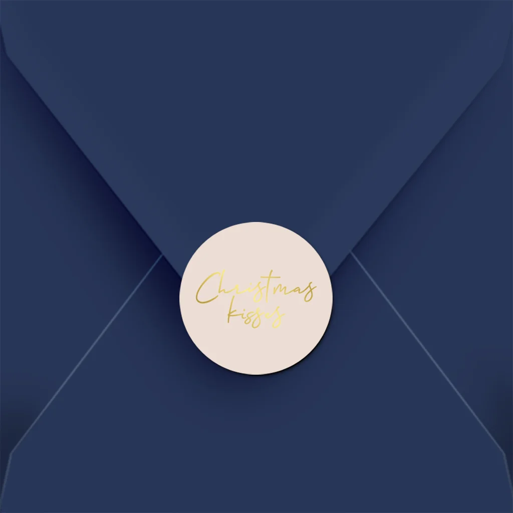 Maak van de kerstkaart een feestje op de deurmat met een gekleurde envelop in combinatie met een bijpassende sluitsticker. Deze sluitsticker is extra feestelijk door het luxe folie. Tip! Je kunt de sticker evt. nog bewerken in onze editor.