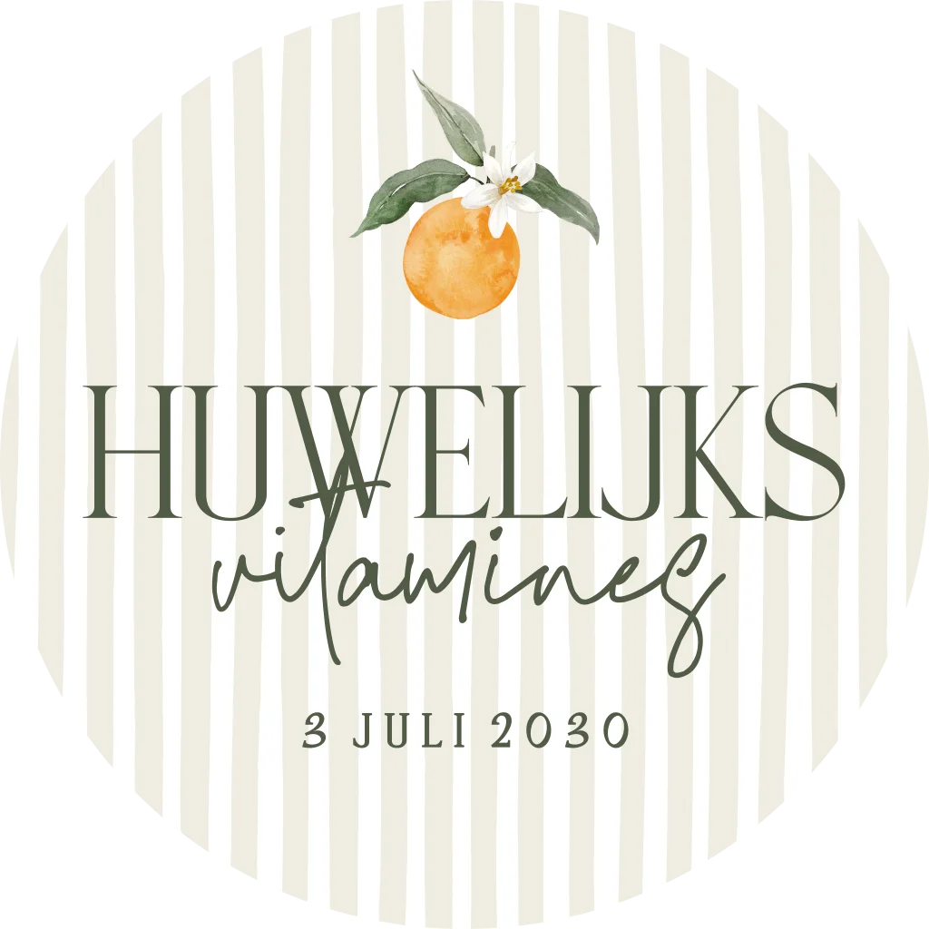 Geef jullie gasten 'huwelijksvitamines' bij aankomst of vertrek van jullie bruiloft. Plak deze ronde sticker bijvoorbeeld op een flesje of potje.