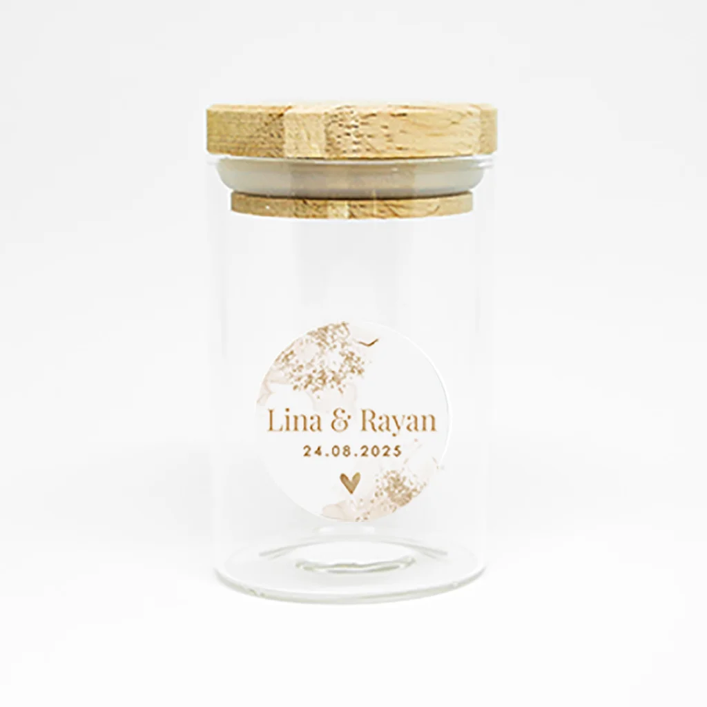 Hoe gaaf zijn stickers voor jullie trouwbedankjes in de stijl van jullie trouwkaart? Vertaal het ontwerp door naar deze speciale bedankjes en laat alles met elkaar matchen. Bewerk de ronde stickers gemakkelijk in de editor. Thuis hoef je ze enkel nog op een leuk item zoals een zeepje, kaarsje of potje te plakken.