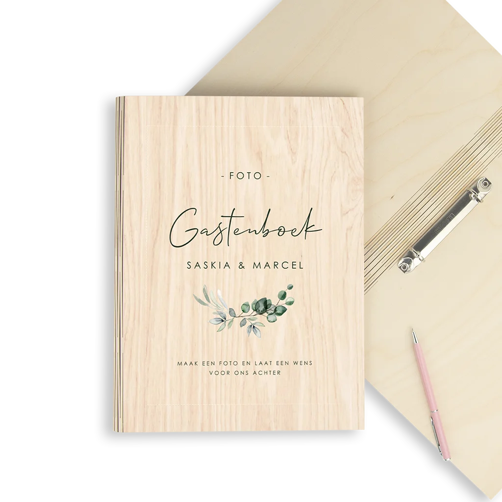 Houten gastenboek met eucalyptus takjes en sierlijke tekst