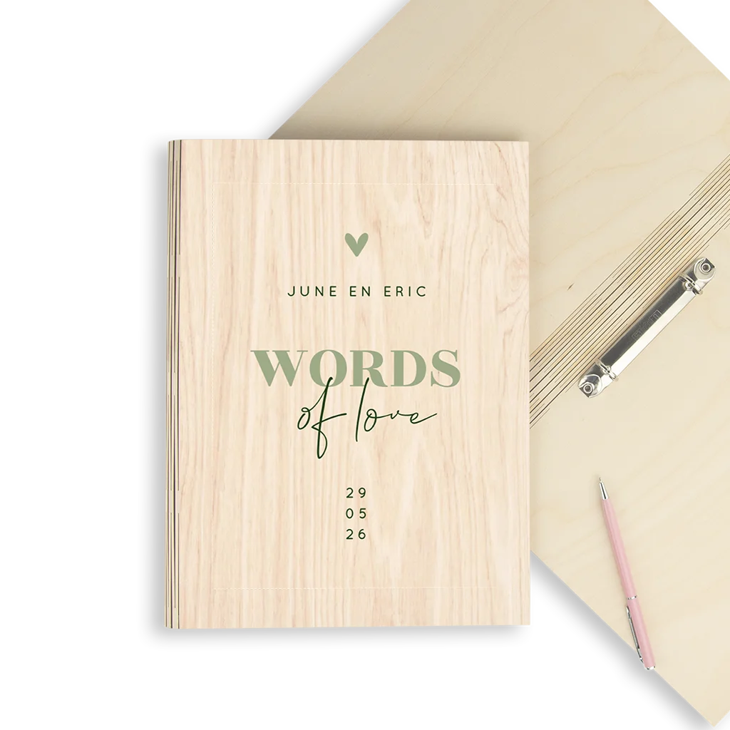 Een houten gastenboek in de stijl van jullie bruiloft met 2 ringen om zelf binnenwerk in te bundelen. Pas kleuren en typografie naar wens aan in de editor! De hele collectie bekijken? Je vindt alle gastenboeken hier.