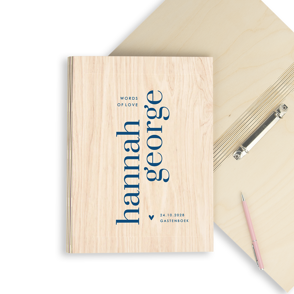 Houten gastenboek met blauwe colorblocking en hartje