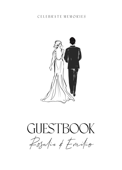Houten gastenboek met inkttekening van bruidspaar. Het boek heeft 2 ringen om zelf binnenwerk in te bundelen. Pas kleuren en typografie naar wens aan in de online editor.