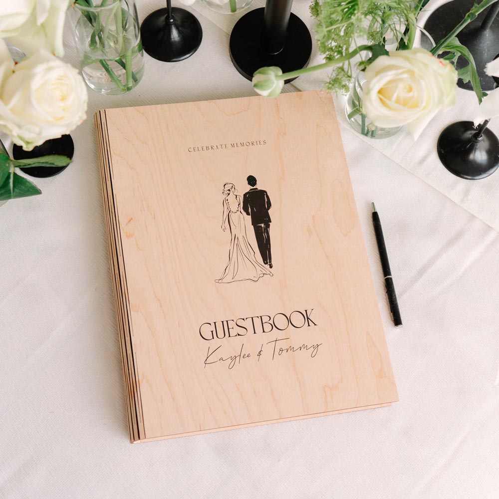 Houten gastenboek met inkttekening van bruidspaar