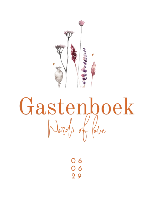 Houten gastenboek met bloemen en oranje belettering. Het boek heeft twee ringen om zelf binnenwerk in te bundelen.