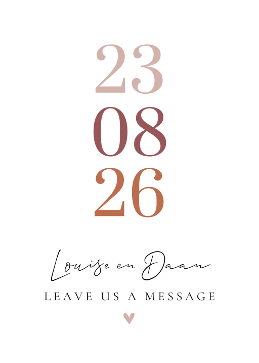 Een mooi houten gastenboek, perfect voor de stijlvolle bruiloft! Het boek heeft 2 ringen om zelf binnenwerk in te bundelen. Pas kleuren en typografie naar wens aan in de online editor. De hele collectie bekijken? Je vindt alle gastenboeken hier.